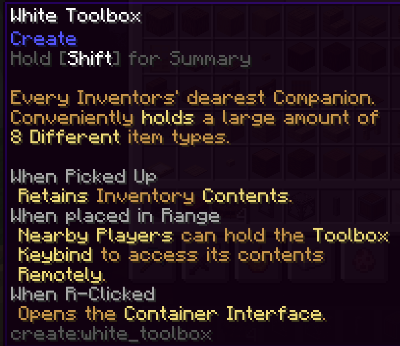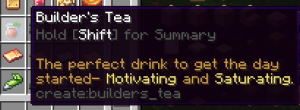 Builder's Tea는 건축 관련 도구는 아니지만 포만감과 함께 성급함 효과를 줘서 채굴에 도움을 주는만큼 툴팁 스크린샷만 첨부해봤습니다. 그 외 효과는 없는 다른 요리들도 있습니다만 이건 Create Wiki(https://create.fandom.com/wiki/Create_Mod_Wiki)에서 확인하실 수 있습니다.