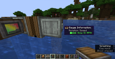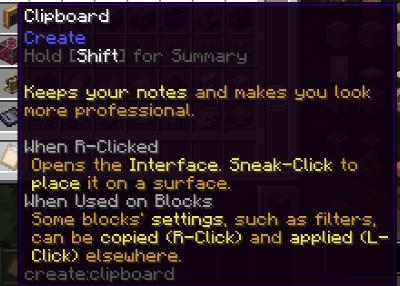 Create의 여러 장치들은 매우 직관적입니다. 그래서 설명이 보통 필요없을 정도인데요, 가끔은 블록 하나에 여러 기능이 있는 경우가 있습니다. Create 초기 버전에서는 보통 렌치를 통해 설정했었는데요, 최신 버전에서는 아래와 같이 블록 가운데에 포커스를 둔 뒤 계속 우클릭을 누른 상태에서 모드를 전환할 수 있습니다. 자세한 내용들은 Ponder 화면이나 Tooltip에 잘 설명되어 있기 때문에 생략하겠습니다.