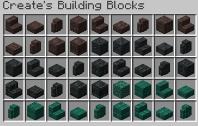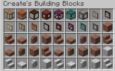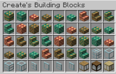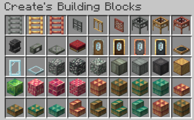 Casing을 모아둔 스크린샷입니다. Andesite, Brass, Copper, Train Casing이 포함되어 있습니다. 나중에 설명하겠지만, Belt 받침대나 Shaft를 설치하느라 생긴 빈 공간을 깔끔하게 정리하는 데 쓰이기도 합니다.