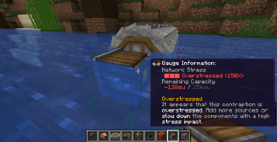 여기서 기계 네트워크라는 말을 했는데요, 톱니바퀴와 벨트 등으로 연결된 하나의 기계 네트워크는 하나의 Stress Capacity를 공유하고, 네트워크의 Stress Capacity는 각 동력을 만드는 장치의 Stress Capacity를 다 더한 값으로 구해집니다. Stressometer 장치를 연결하고 고글을 끼면 네트워크의 Stress Capacity와 Stress 정보를 볼 수 있습니다.