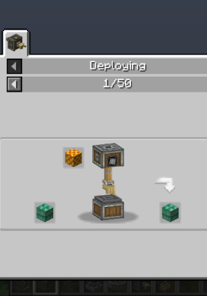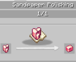 Depolying은 Deployer를 활용한 레시피로 손으로 우클릭해서 가공하는 레시피들(구리 블록에 왁스칠을 하는 등)이 기본 등록되어 있습니다. Deployer를 한 번 사용하면 완료되는 레시피도 있지만, 여러 번의 가공을 필요로 하는 레시피도 있습니다. Polished Rose Quartz를 만들기 위해 한 손에는 Rose Quartz를 한 손에는 Sandpaper를 들고 진행해야 하기 때문에 자동화를 위해 Deployer를 이용해 볼 수 있겠습니다.