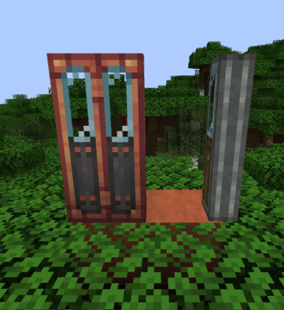 그다음은 Andesite, Copper, Glass, Train Door입니다. Copper랑 Andesite는 접히는 방식으로 열리고, Glass랑 Train Door는 슬라이딩 도어입니다. 잘 설치하면 두 문을 한 번에 움직이도록 만들 수도 있습니다. (설치할 때 왼쪽 블록은 왼쪽 모서리를 오른쪽 블럭은 오른쪽 모서리 쪽에 설치하면 됩니다)