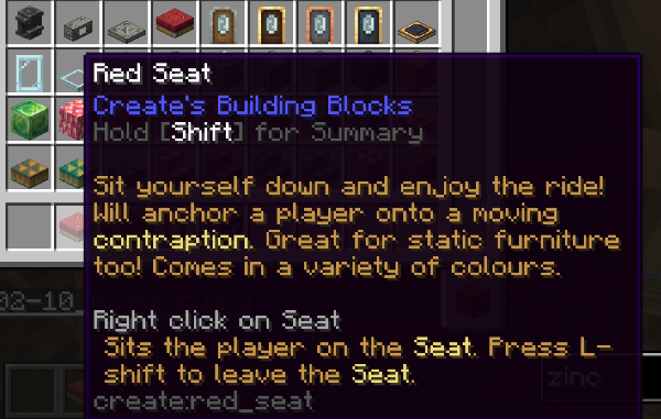 Red Seat는 다른 색 버전도 있으며, 기차 등에 설치할 수도 있지만 그냥 블록으로 설치해서 의자로 쓸 수도 있습니다.