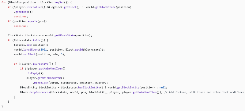 건축을 도와주는 도구 및 블록들도 있는데요, Ponder Index에 없는 것 같아 간단하게 아이템 툴팁만 올려드립니다. 이 중에서 가장 자주 쓰는 도구인 Wand of Symmetry는 대칭적으로 빠르게 건축하기 위해서 쓰이는데요, 빠르게 채굴하려고 쓰기도 합니다. 내구도는 그만큼 빨리 닳고, 다른 모드에서 추가한 특수 도구 등은 잘 작동하지 않을 수도 있습니다. (예전 공략글 댓글로 이를 알려주신 ZoniIC645님 감사드립니다.) 아래 코드에서 보실 수 있듯이 섬세한 손길이나 행운 등 기본적인 인챈트는 작동합니다.