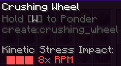 예를 들자면 Water Wheel의 경우 동력을 만드는 기능을 가지고 있습니다. 이렇게 만들어진 동력은 Stress Capacity라는 이름으로 수치화됩니다. 반대로 Crushing Wheel의 경우 동력을 이용하는 역할인데요, 이러한 장치들은 Stress Impact 수치를 가져서 연결된 기계 네트워크에 Stress를 줍니다.
