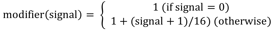 modifier 2개의 비율만 생각하면 됩니다. modifier_IN/modifier_OUT = 15.24/16 = 0.9525입니다. modifier는 1과 2 사이의 값으로 1/16의 배수입니다. 계산을 편리하게 하기 위해 16*modifier_X 값을 M_X라고 둬봅시다. 그러면 M_X는 16과 32 사이의 정수로, M_IN/M_OUT = 0.9525입니다. 이제부터 약간의 노가다가 들어가는데요, 0.9525는 분수로 표현하자면 20.00/21에 가깝습니다. 반대로 신호를 역산하면 입력부 신호는 3, 출력부 신호는 4가 됩니다.