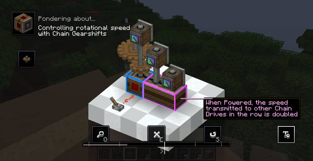 | Adjustable Chain Gearshift | 레드스톤 신호에 따라 연결된 Encased Chain Drive와 Adjustable Chain Gearshift 속력 조절 | 속력 미세 조정 가능 |